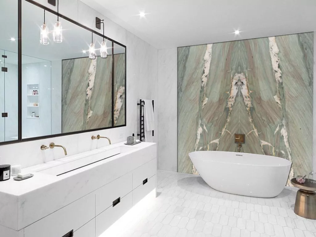 Esta cuarcita es una obra maestra de la naturaleza, caracterizada por una cautivadora mezcla de tonos verdes suaves que evocan serenidad y frescura. Las vetas irregulares en blanco y beige se entrelazan de manera fluida, creando un diseño orgánico y dinámico que parece capturar los movimientos tectónicos y la energía de su formación geológica. Estos patrones únicos son el resultado de la recristalización de minerales secundarios, como las micas o la clorita, que añaden profundidad visual y un toque de lujo natural.