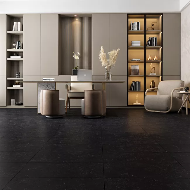 Este mármol destaca por su elegancia atemporal. Su tono gris oscuro, casi antracita, envuelve los espacios con un aire contemporáneo y sobrio. Las delicadas vetas blancas, que se entrelazan suavemente en patrones irregulares, añaden un toque de movimiento y contraste que realza su belleza natural.
